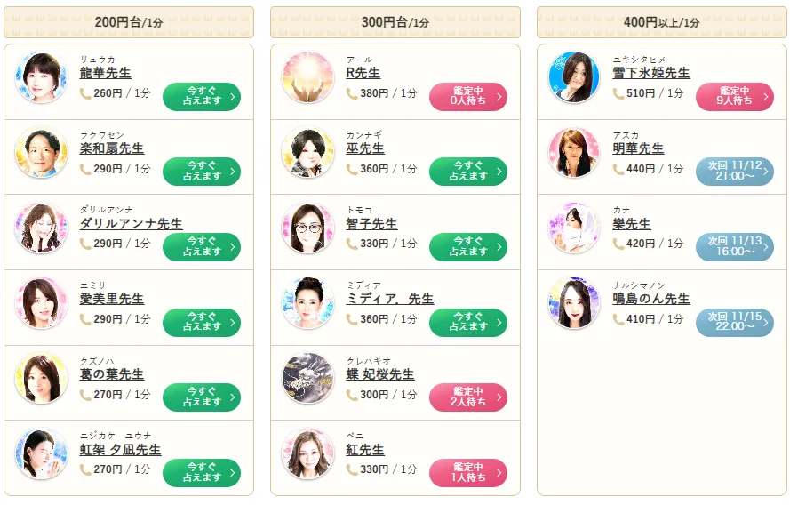 鑑定料金は占い師ごとに設定されており、1分あたり240円〜390円前後が中心。霊視や波動修正、縁結びなど、先生ごとの占術やスタイルが明記されているため、自分の悩みや好みにぴったりの占い師を簡単に見つけられます。実際のレビューを確認しながら選べるのも心強い点です。