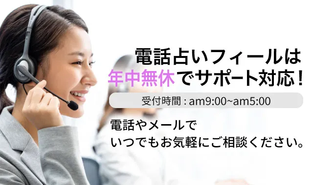 電話占いフィールは鑑定の質を重視しており、恋愛・仕事・人間関係・健康など、あらゆる悩みを解決へと導きます。特に不倫や復縁といった複雑な恋愛相談に長けた占い師が数多く所属しているのが強みです。