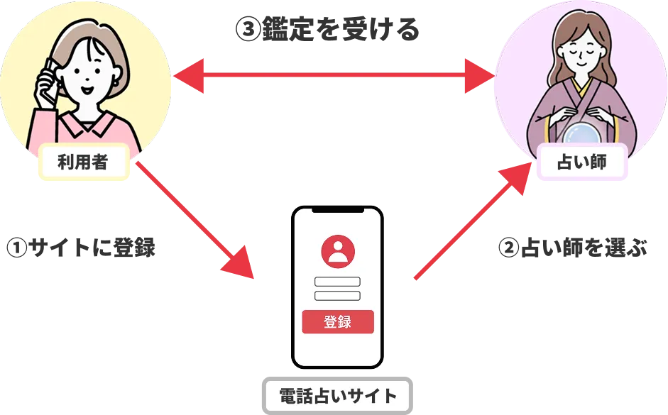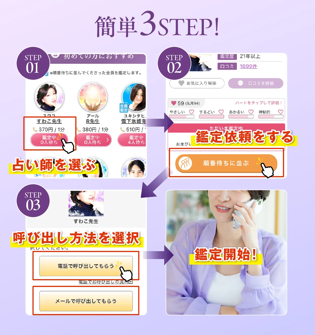 利用手順は非常にシンプルで、新規登録から3ステップで簡単に電話鑑定が始められます。