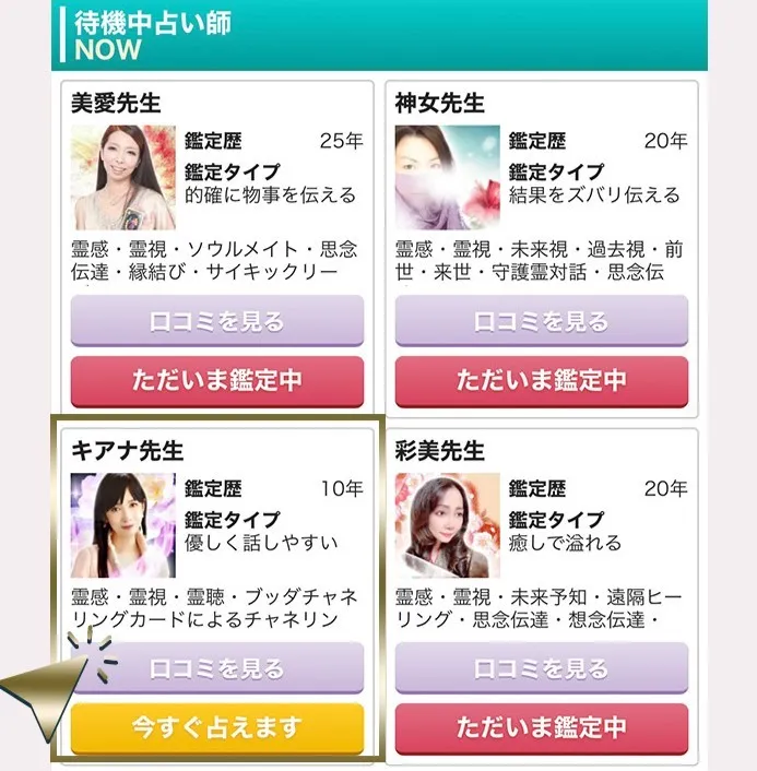 対象の占い師を選ぶだけで自動的に特典が適用されるため、複雑な手続きは一切不要。どのような鑑定スタイルなのか、自分との相性は良いのかを、まずは無料で気軽に体験することが可能です。