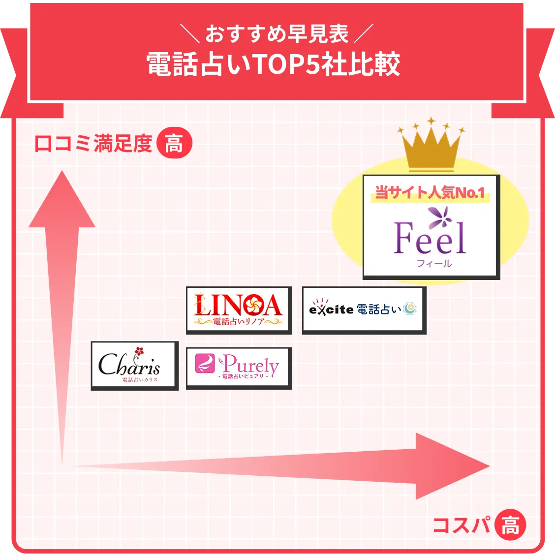| 特徴 | 電話占い口コミランキング驚異の5冠達成!採用率5%の凄腕占い師が勢揃い。政界人も認める業界最高峰の本物鑑定が受けられる。 | 2024年OPENの新規サイト!日本最大級の占いプロダクションが満を持して立ち上げた注目の電話占いサイトが登場。 | 「当たる」口コミ8万件以上!上場企業エキサイト運営。専用アプリを使えば通話料が完全無料に。 | 芸能人も大絶賛する実力派占い師が勢ぞろい!メディア露出が多く知名度が高い! | 2017年に占い専用プロダクションが手掛け誕生した、比較的新しいサイト。 |