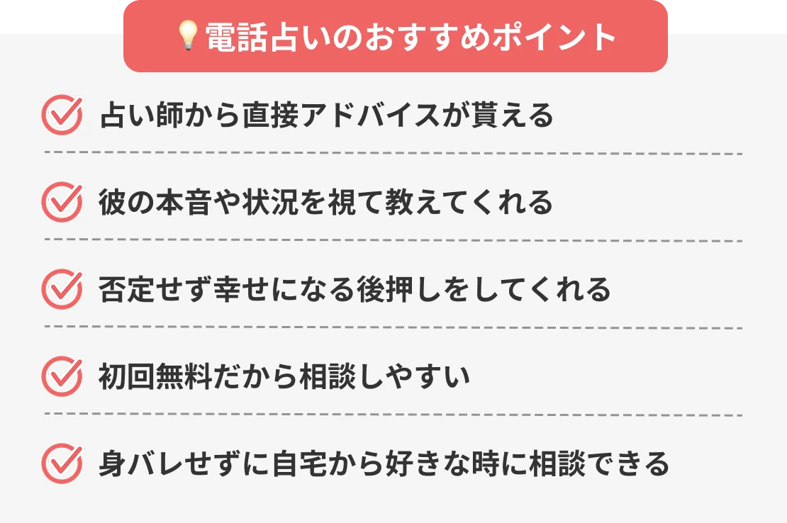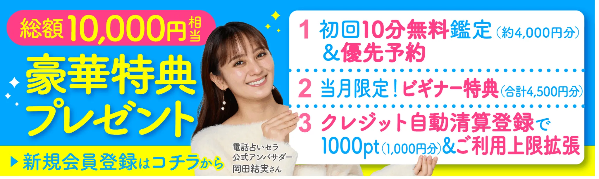 電話占い未経験の方にとって非常にメリットのある内容ですので、まずは無料の10分間を活用して、現在の悩みの根源や気になる相手の気持ちを相談してみてはいかがでしょうか。